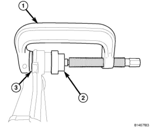 1. Install axle tube bushing with Press C-4212F (1), bushing Installer 9511 (2) and bushing Receiver 9536-2 (3).
