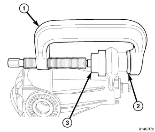 2. Install pinion nose bushing with Press C-4212F (1), bushing Installer 9536-2 (2) and bushing Receiver 9511(3).