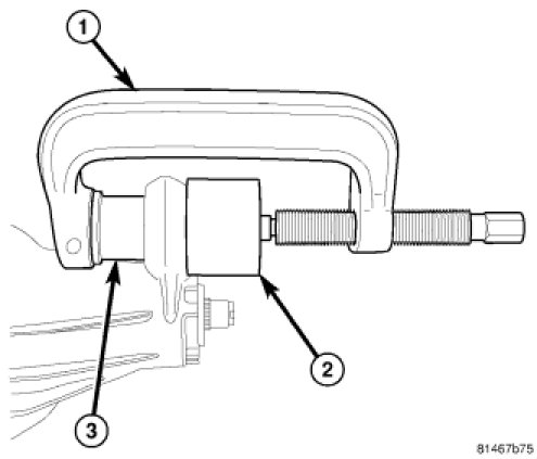 5. Remove axle tube bushing with Press C-4212F (1) bushing Receiver 9536 (2) and bushing Remover 9512 (3).