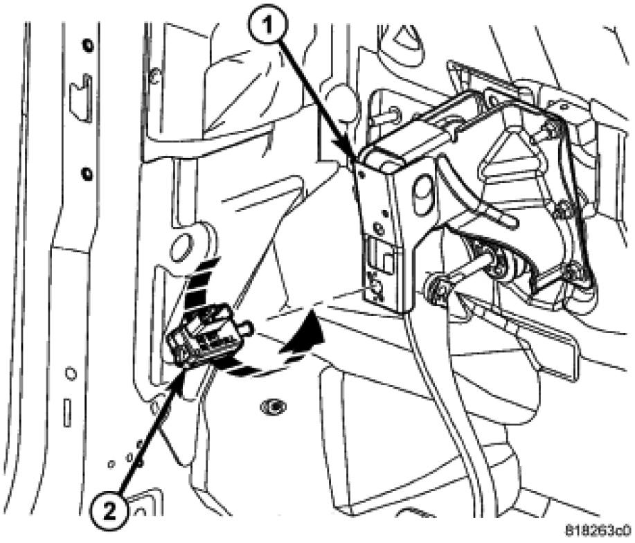 6. Remove the stop lamp switch wiring routing clip (1) from the brake pedal bracket (2).
