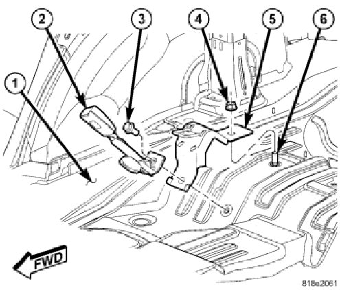 3. Reinstall the second row right and center anchor buckle unit (2) onto the rear floor panel. Seat Belt Buckle - Installation.