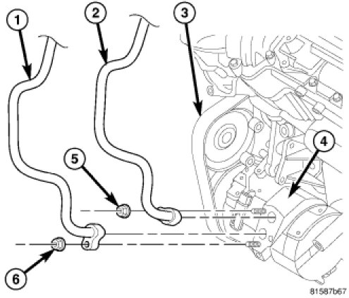 7. Install the nuts (5 and 6) that secure the refrigerant lines to the A/C compressor. Tighten the nuts to 20 Nm (15 ft. lbs.).