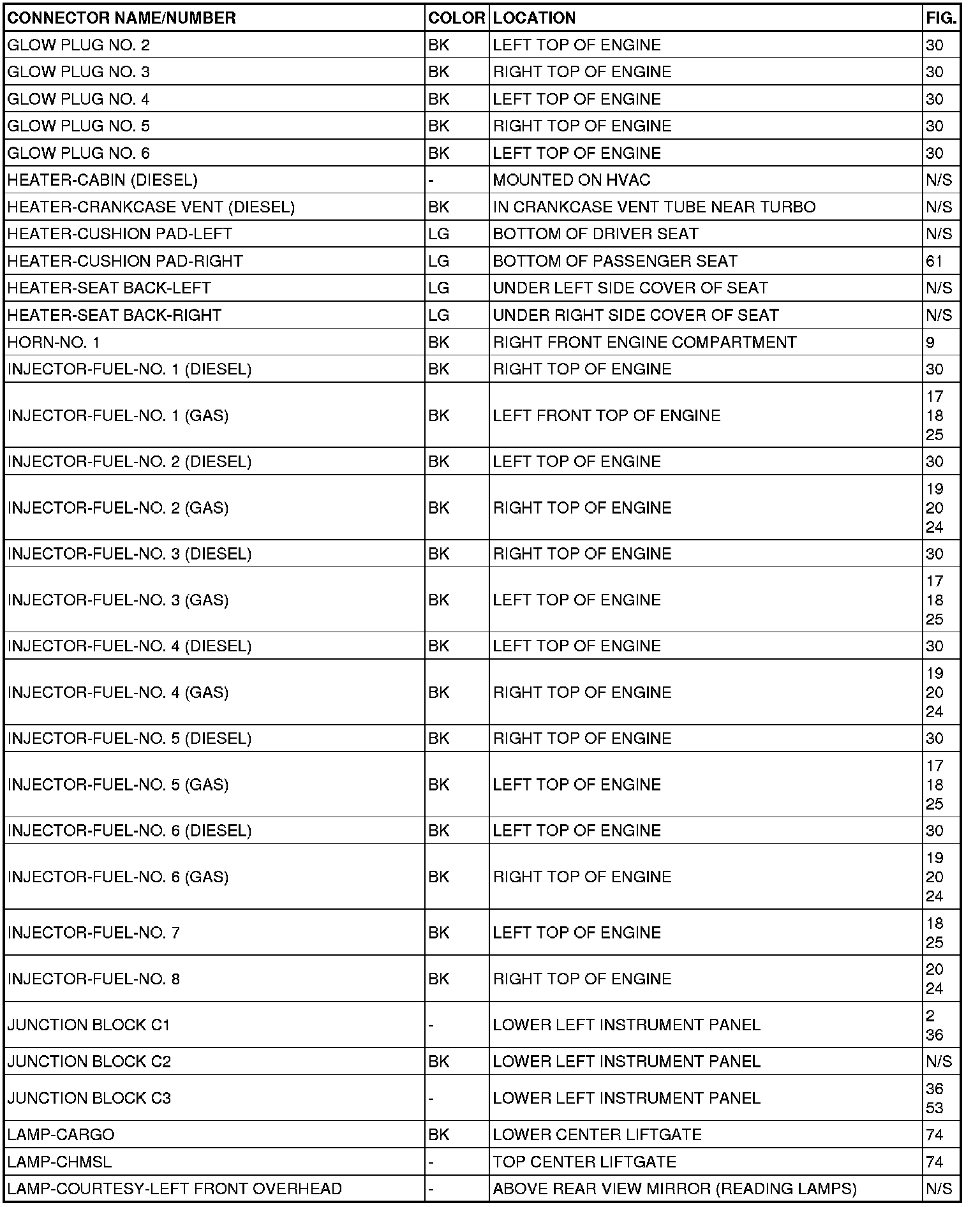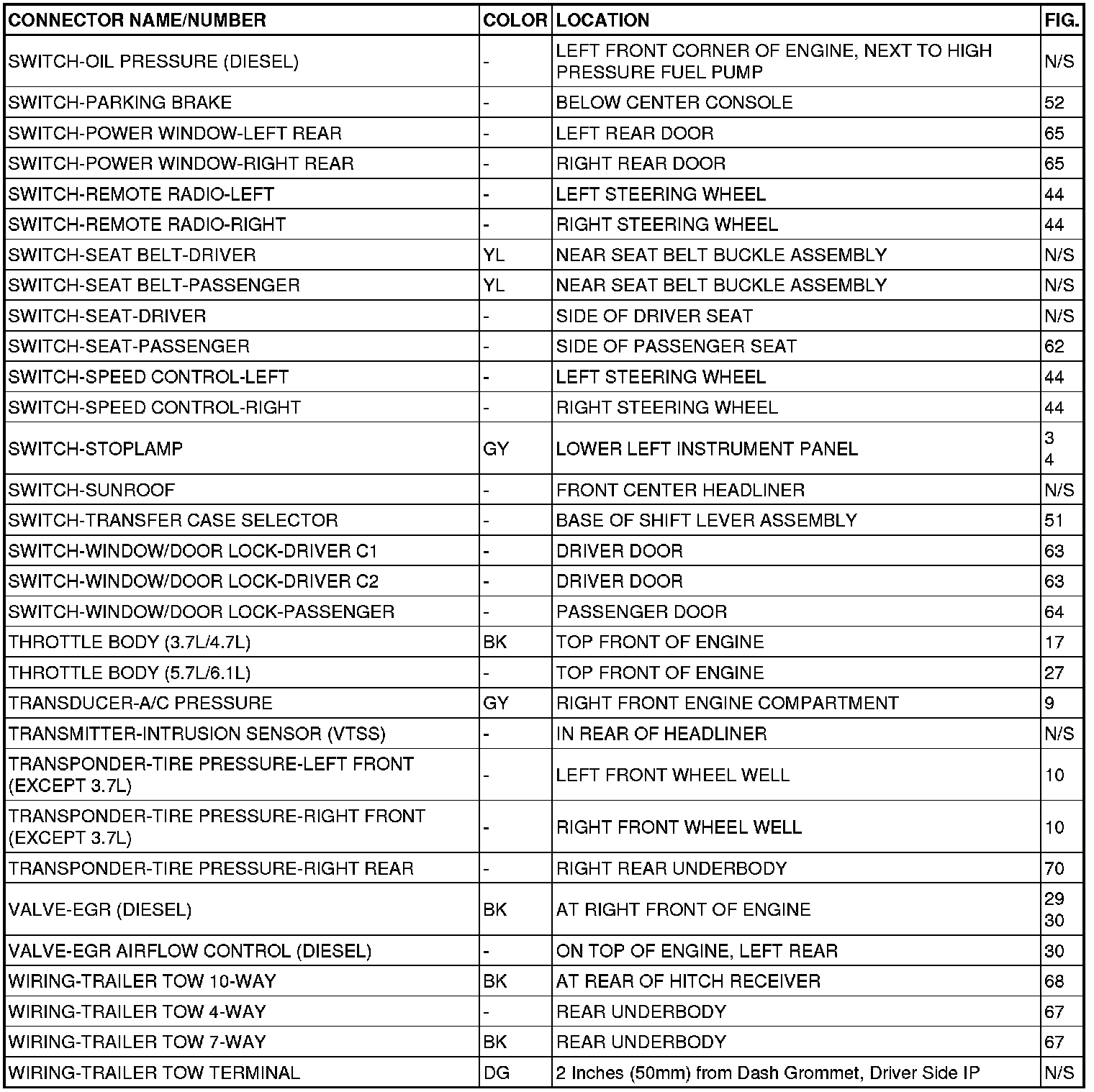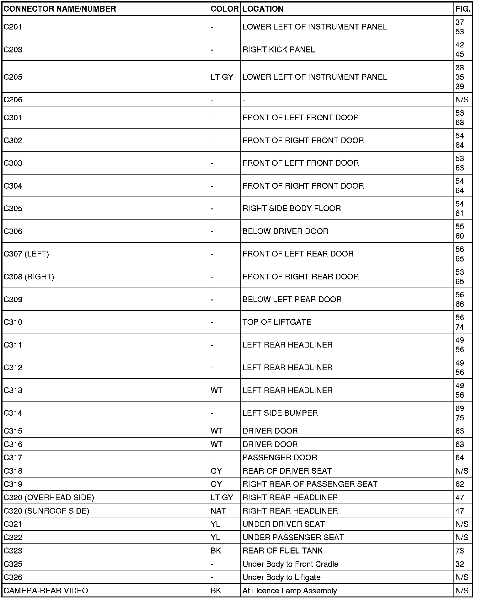 This section provides illustrations identifying connector, ground and splice locations in the vehicle. Connector, ground and splice indexes are provided. Use the wiring diagrams in each section for connector, ground and splice identification. Refer to the appropriate index for the proper figure number. For items that are not shown in this section N/S is placed in the Fig. column.
