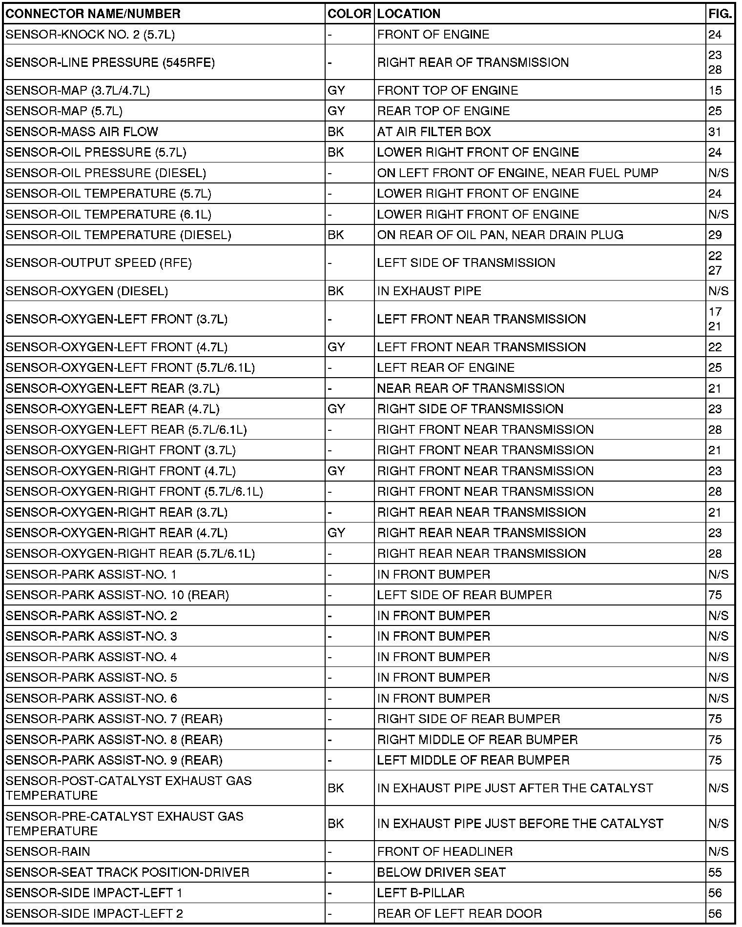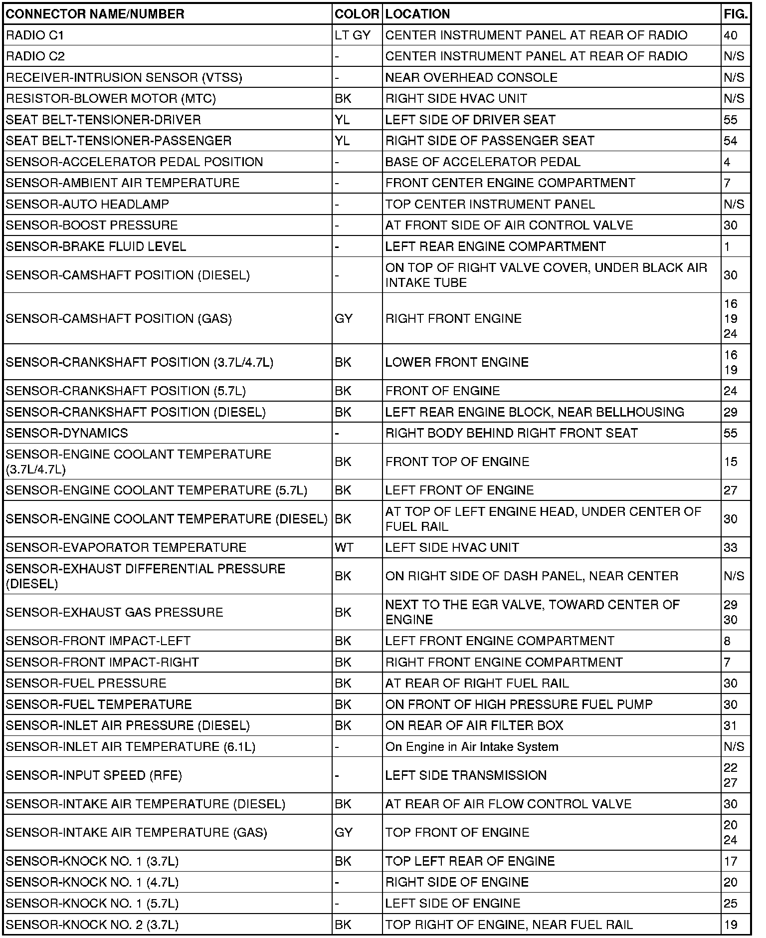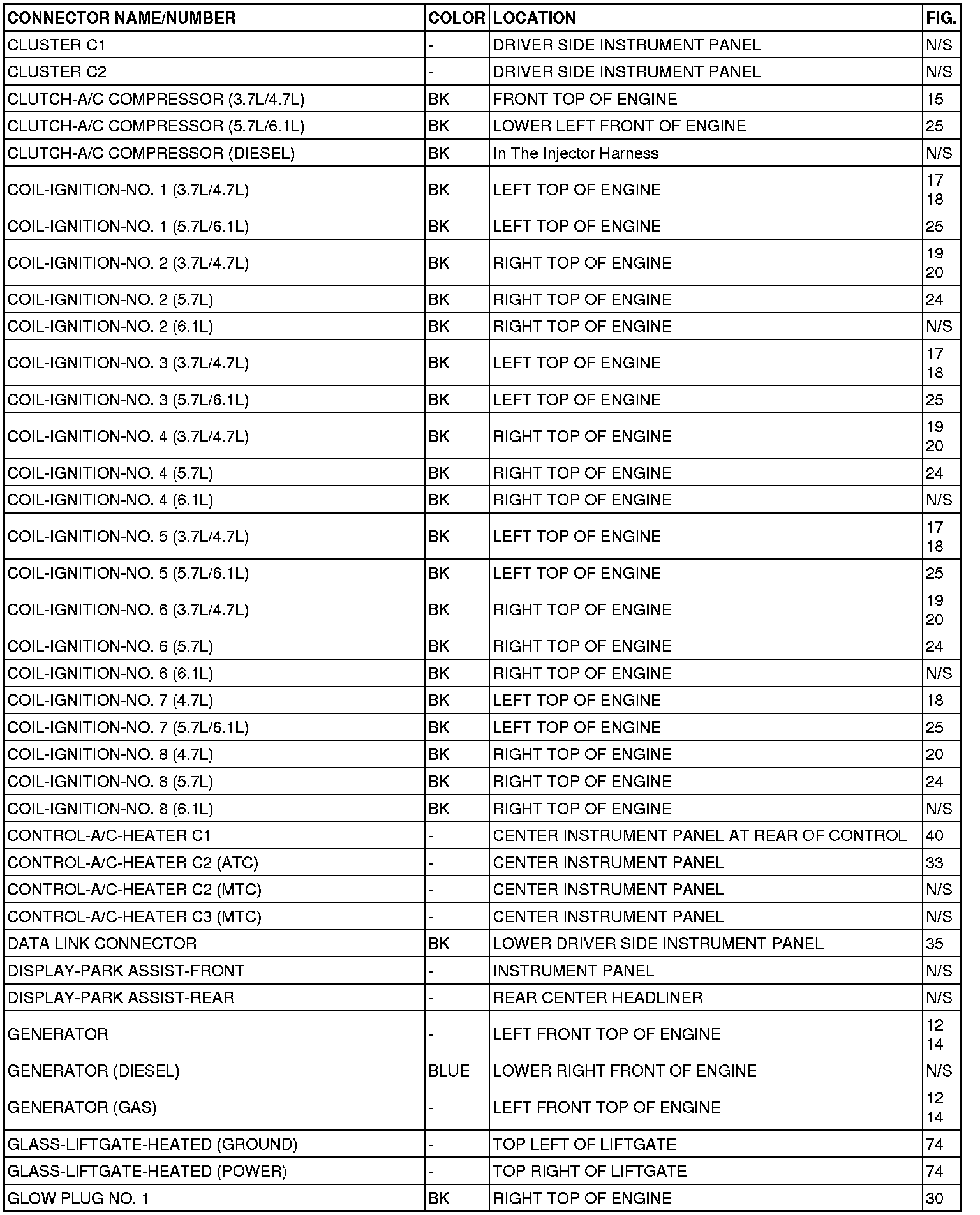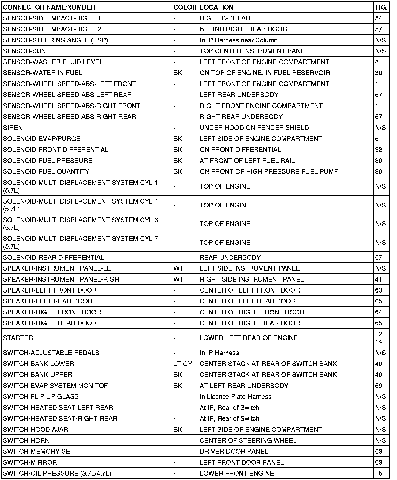 This section provides illustrations identifying connector, ground and splice locations in the vehicle. Connector, ground and splice indexes are provided. Use the wiring diagrams in each section for connector, ground and splice identification. Refer to the appropriate index for the proper figure number. For items that are not shown in this section N/S is placed in the Fig. column.