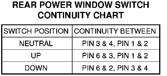 4. Test the power window switch continuity. See the Power Window Switch Continuity chart to determine if the continuity is correct in the Neutral, Up and Down switch positions. If OK, Testing and Inspection. If not OK, replace the inoperative switch.