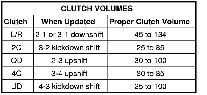 Certain mechanical failures within the input clutch assembly can cause inadequate or out-of-range element volumes. Also, defective Input/Output Speed Sensors and wiring can cause these conditions. The following chart identifies the appropriate clutch volumes and when they are monitored/updated: