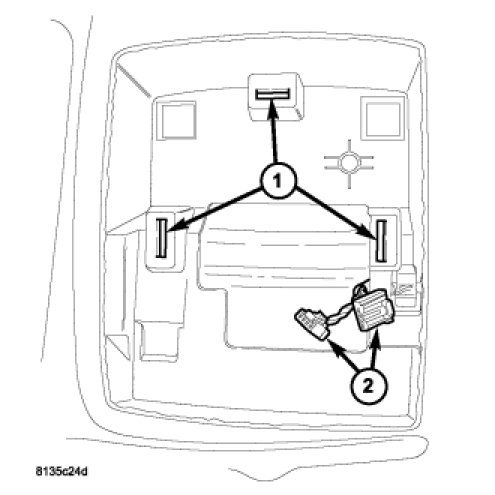 2. Reconnect the roof wire harness connectors (2) to the overhead console.
