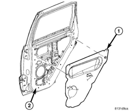 1. Position the rear glass run channel (2) onto the rear door.