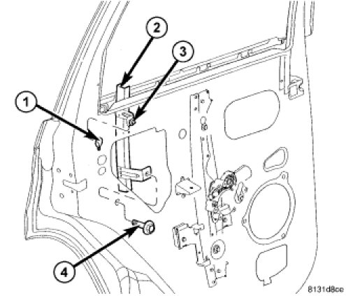 3. Install the bolt (4) that secures the bottom of the rear glass run channel to the inside door panel. Tighten the bolt to 8.5 Nm (75 in. lbs.).