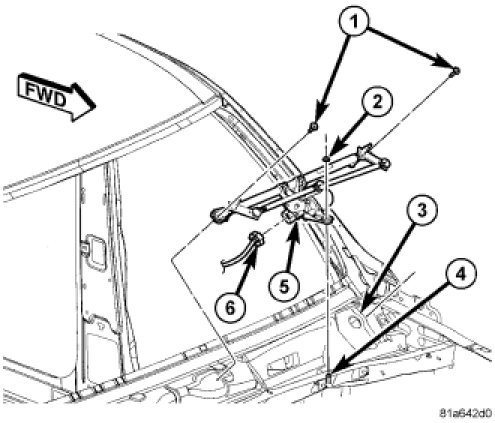 4. Disconnect the wire harness connector (6) for the front wiper motor (5) from the motor connector receptacle.