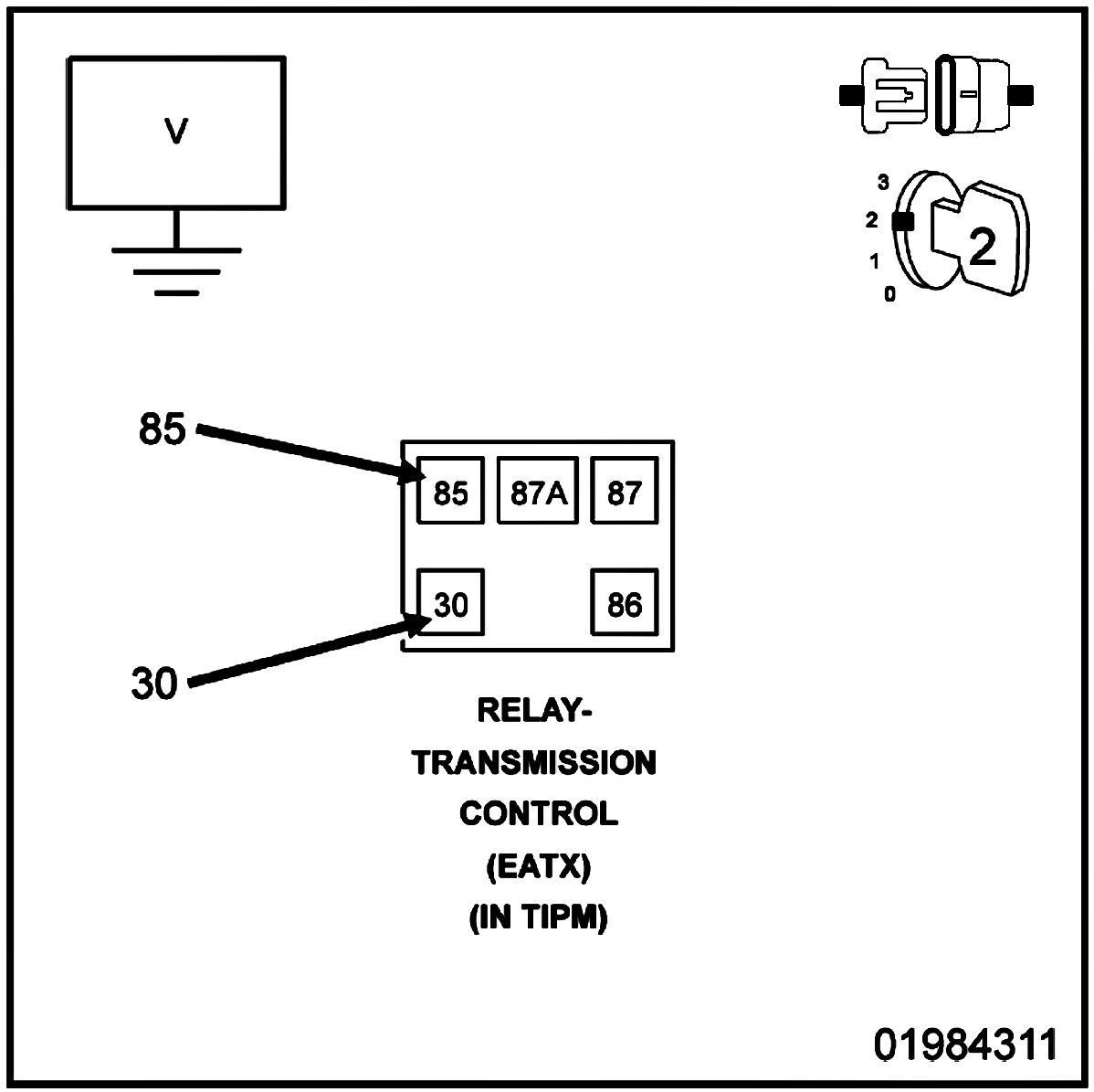3. Measure the voltage of the Internal Fused (B+) circuit between ground and the Transmission Control relay connector in the TIPM.