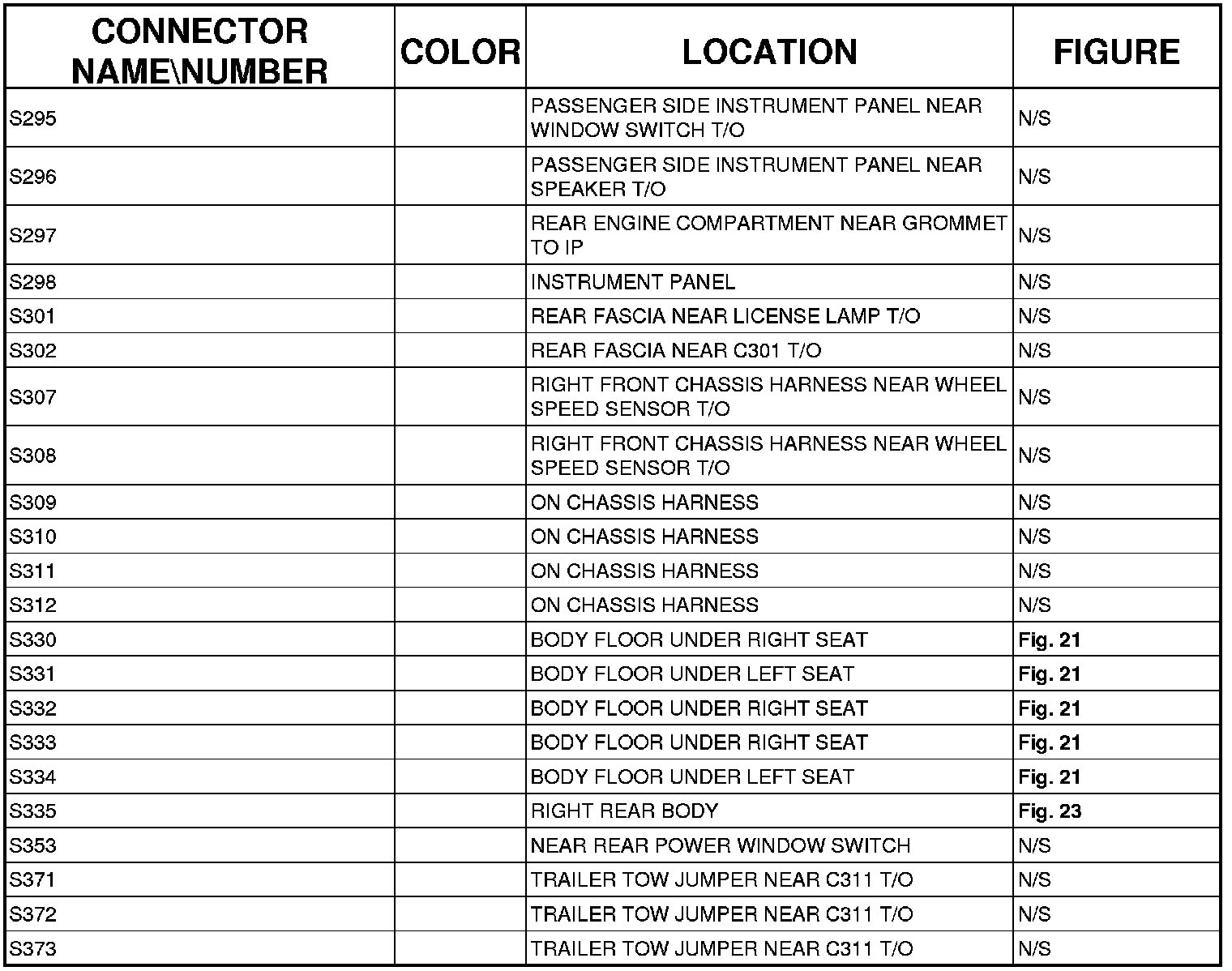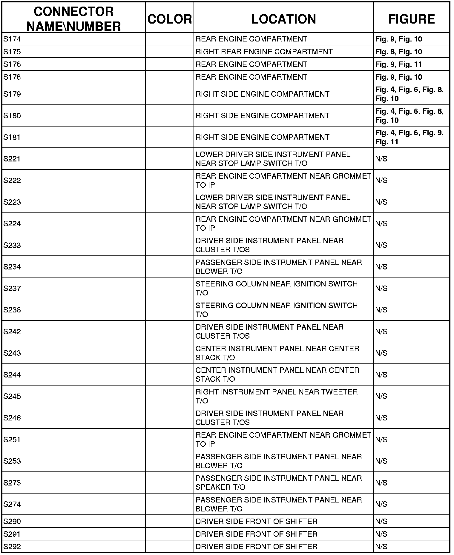 The abbreviation T/O (Take Out) is used in the location column to indicate a point in which the wiring harness branches out to a component.