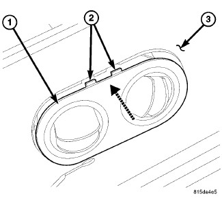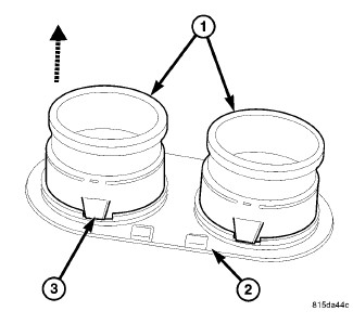 1. Align the upper rear air outlets (1) with the openings of the rear upper air duct and install the air outlets into the upper rear air outlet bezel (2) as necessary. Make sure that each of the air outlet's three retaining clips (3) are fully engaged to the bezel.