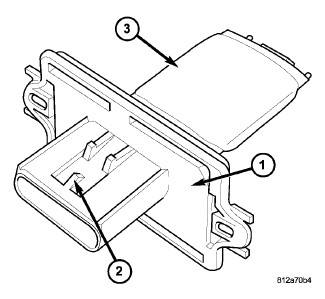 The blower motor resistor is mounted to the rear of the HVAC housing, directly behind the glove box. The blower motor resistor consists of a molded plastic mounting plate (1) with an integral wire connector receptacle (2). Concealed behind the mounting plate are coiled resistor wires contained within a ceramic heat sink (3).