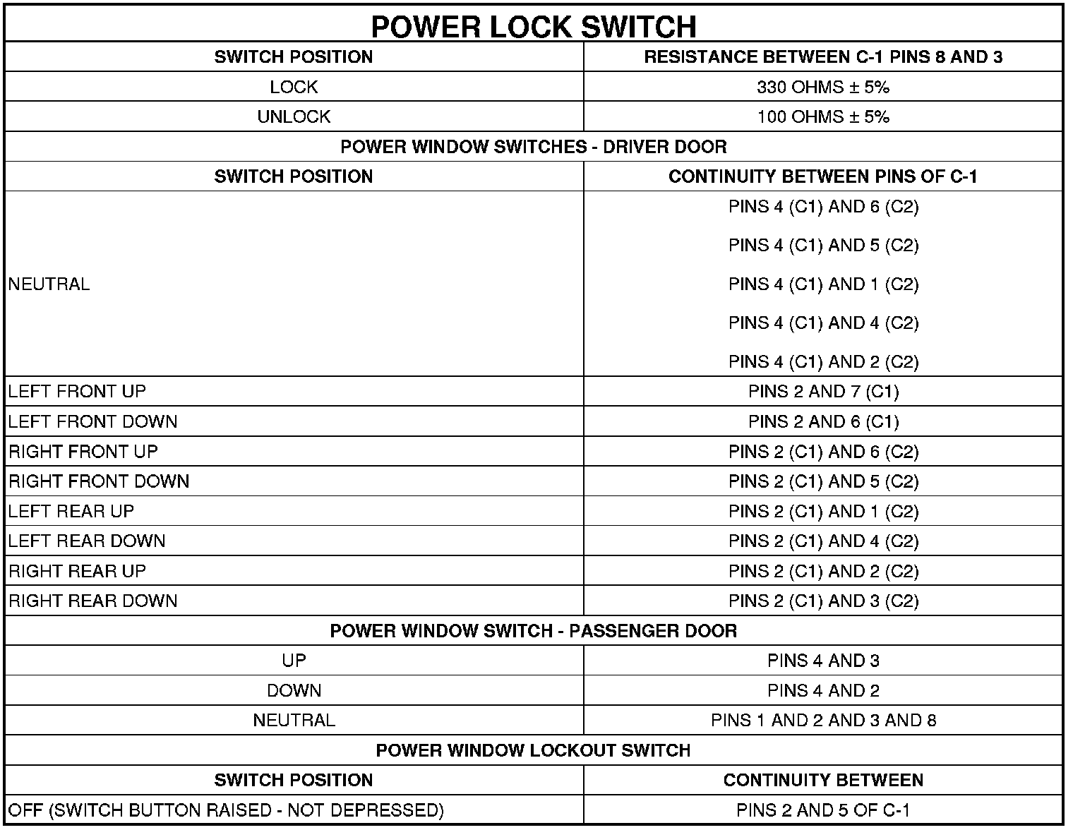 2. Test the switch continuity. See the Switch Tests chart to determine if the continuity is correct for the suspect switches in each switch position. If not OK, replace the faulty window/lock switch as required.