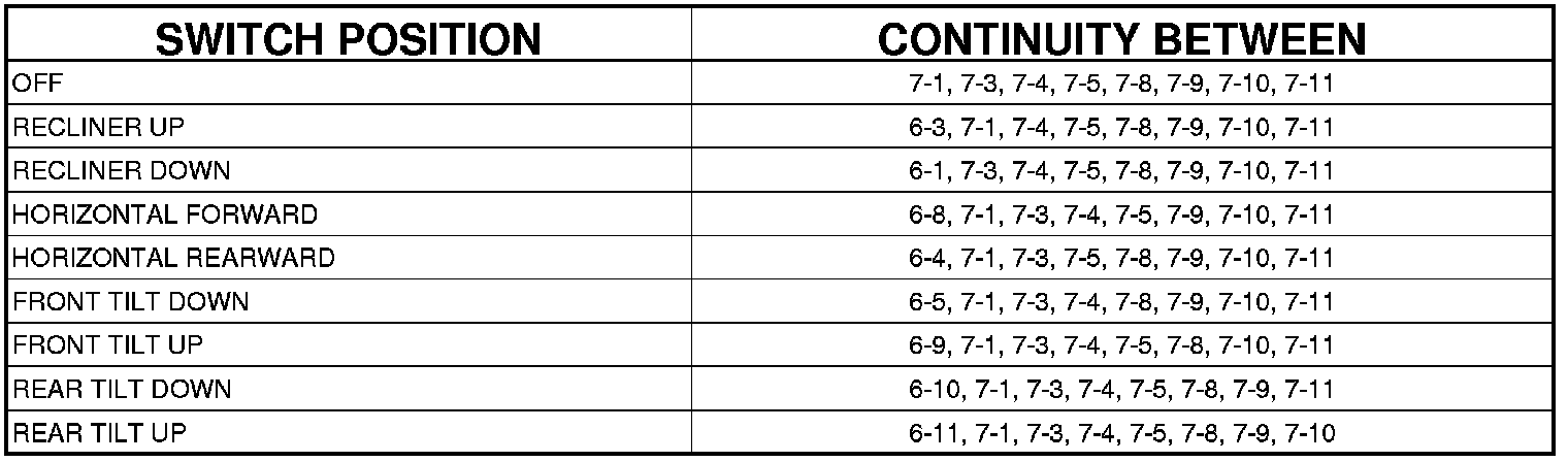 3. Use an ohmmeter to test the continuity of the power seat switch. Refer to DRIVER POWER SEAT SWITCH WITHOUT MEMORY SEAT SYSTEM CONTINUITY table. If not OK, replace the faulty power seat switch. If switch tests OK Component Tests and General Diagnostics.