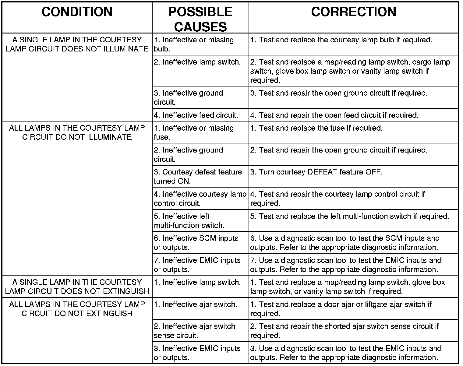 However, conventional diagnostic methods will not prove conclusive in the diagnosis of the interior lighting system or the electronic controls or communication between modules and other devices that provide some features of the interior lighting system. The most reliable, efficient, and accurate means to diagnose the interior lighting system or the electronic controls and communication related to interior lighting system operation requires the use of a diagnostic scan tool. Refer to the appropriate diagnostic information.