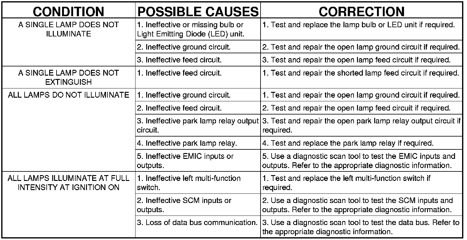 NOTE: As part of the exterior lighting fail-safe feature, upon ignition ON all of the panel lamps dimmer circuit lamps will illuminate at full intensity and the exterior park lamps and headlamp low beams will illuminate regardless of the left multi-function switch control knob position if the Steering Control Module (SCM) cannot detect an input from the left multi-function switch, or if there is a loss of data bus communication.