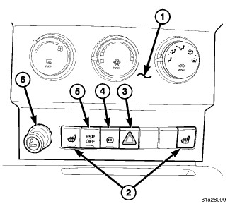 DESCRIPTIONThe ESP switch (5) is located in the center stack (1) of the instrument panel. If the switch is damaged or inoperative the complete accessory switch bank assembly must be replaced.