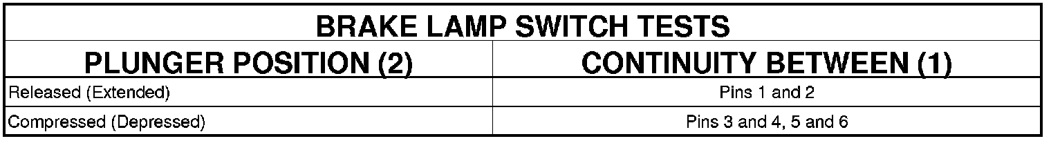 3. Using an ohmmeter, perform the continuity tests at the terminal pins (1) in the brake lamp switch connector receptacle as shown in the Brake Lamp Switch Tests table.