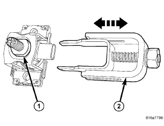 CAUTION: A strain gauge alignment tool (Special Tool No. 9689) (2) must be used to secure the body of the seat weight sensor (1) from any rotation during removal or installation of the nut that secures the sensor stud to the seat track riser. In addition, the sensor fasteners should always be serviced using hand tools ONLY, and not electric or pneumatic power tools. Failure to observe these cautions may result in irreversible sensor damage requiring sensor replacement.