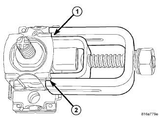 4. Install the strain gauge alignment tool (Special Tool 9689) on the sensors by inserting the center fork (1) of the tool between the flats on each side of the sensor body and inside of the cage, then seating the tool support yoke (2) firmly against the outside of the sensor cage.