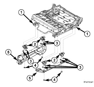 3. Carefully position the seat track risers (5) over all four seat weight sensor studs.