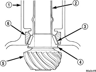 Compensation for pinion depth variance is achieved with select shims (4). The shims are placed behind the rear pinion bearing.
