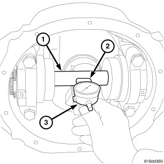 5. Pull axle shaft out until it stops and record dial indicator end-play reading. Rotate axle shaft about 180 degrees and record dial indicator end-play reading again. Two readings should be within 0.05 mm (0.002 in.).
