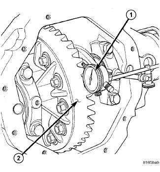 10. Measure and backlash at 4 positions, 90 degrees apart around the ring gear. Maximum ring gear backlash variation is 0.076 mm (0.003 in.).