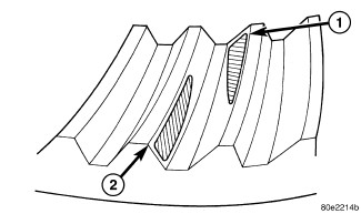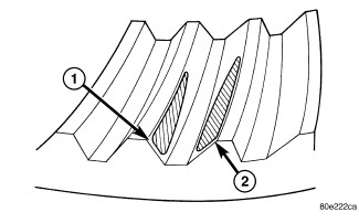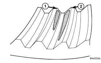 Ring gear is too close to the pinion gear, drive side toe (1) coast side toe (2). Increase backlash by moving ring gear away from the pinion gear using the adjusters.