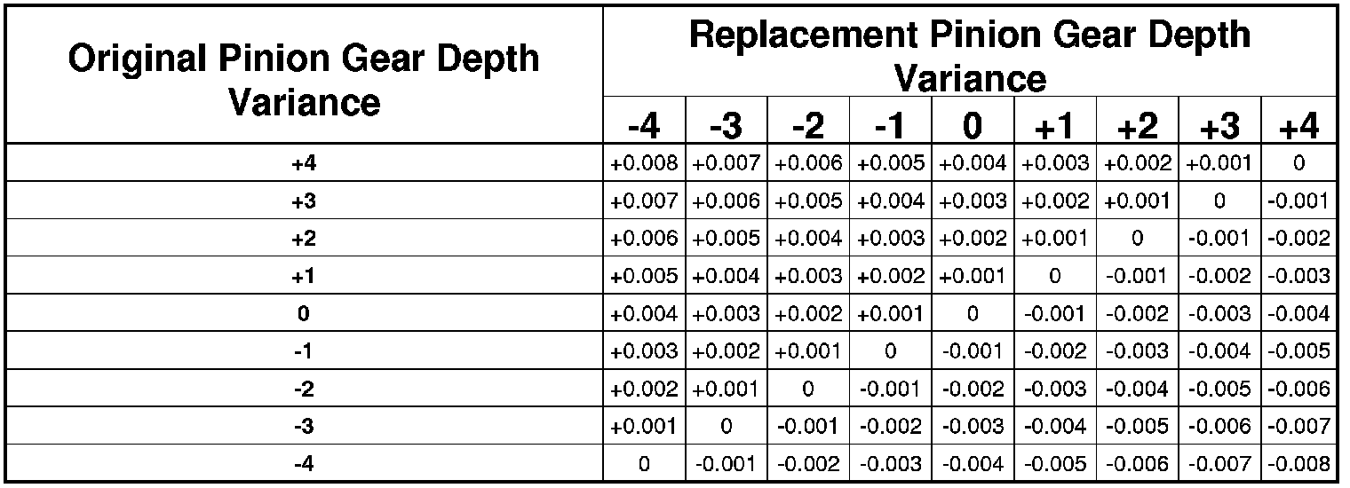 Pinion Gear Depth Variance Chart: Note where Old and New Pinion Marking columns intersect. Intersecting figure represents plus or minus the amount needed.