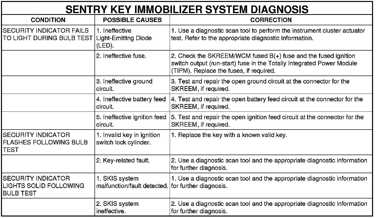 The Vehicle Theft Security System (VTSS) is divided into two basic subsystems: Vehicle Theft Alarm (VTA) and Sentry Key Immobilizer System (SKIS). Following are the recommended procedures for diagnosis of each of these two subsystems.