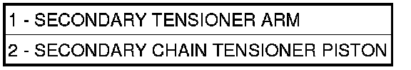 2. To determine if the secondary timing chains are worn, rotate the engine clockwise until maximum tensioner piston (2) extension is obtained. Measure the distance between the secondary timing chain tensioner housing and the step ledge on the piston. The measurement at point (A) must be less than 15mm (.5906 inches).