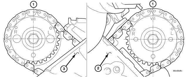 - Secondary chain camshaft sprockets "V6" marks are at 12 o'clock