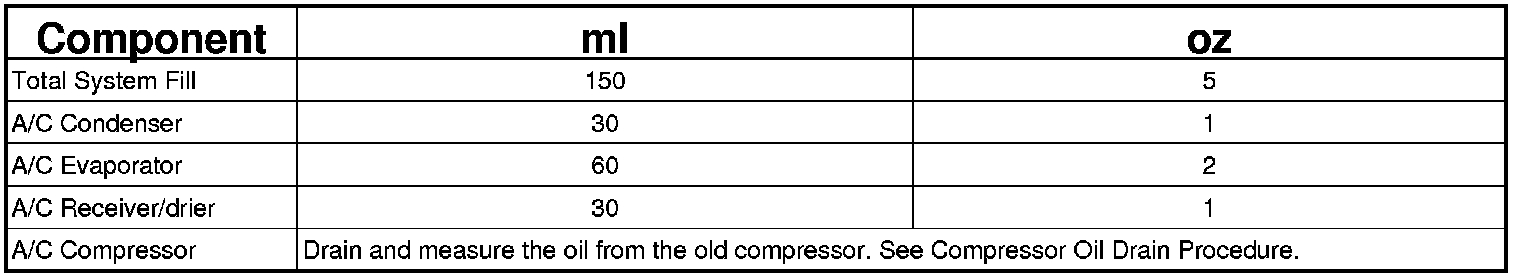 Refrigerant oil must be added when an A/C condenser, A/C evaporator or A/C receiver/drier is replaced. See the Refrigerant Oil Capacities chart.