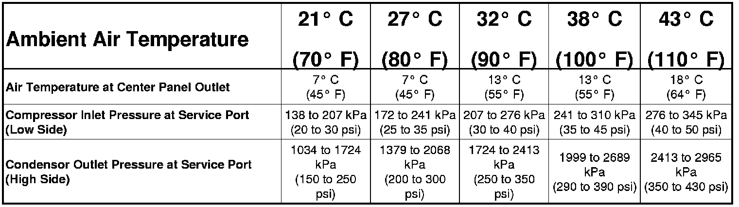 - A/C-heater controls set to Recirculation mode (max-A/C), full cool, panel mode, high blower and with A/C compressor engaged. If the A/C compressor does not engage, see the A/C System Diagnosis table.