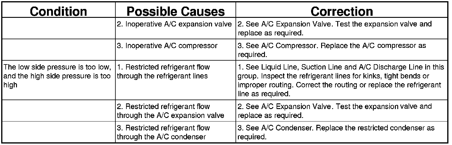 6. If the air outlet temperature fails to meet the specifications in the A/C Performance Temperature and Pressure chart, or if the A/C compressor discharge pressure is high, see the A/C System Diagnosis table.