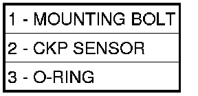 The Crankshaft Position (CKP) sensor (2) is mounted into the right rear side of the cylinder block. It is positioned and bolted into a machined hole.