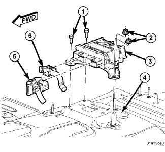 1. Carefully position the Occupant Restraint Controller (ORC) and mounting bracket unit (3) onto the two studs on the left side of the ORC mount (4) on the floor panel transmission tunnel. When the ORC is correctly positioned, the bracket will fit flush with the mount and the orientation arrow on the label on top of the housing will be pointed forward in the vehicle.