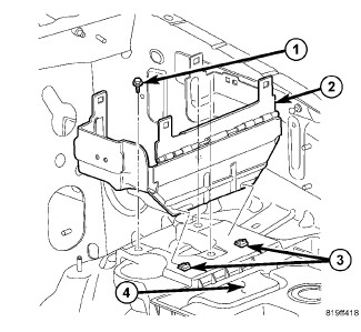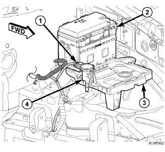 4. Position the TIPM bracket (2) onto the battery tray (4). Slide the bracket (2) forward to engage the slots in the bracket with the mounting tabs of the battery tray (3). Install the TIPM bracket retaining screws (1) into the battery tray (4).