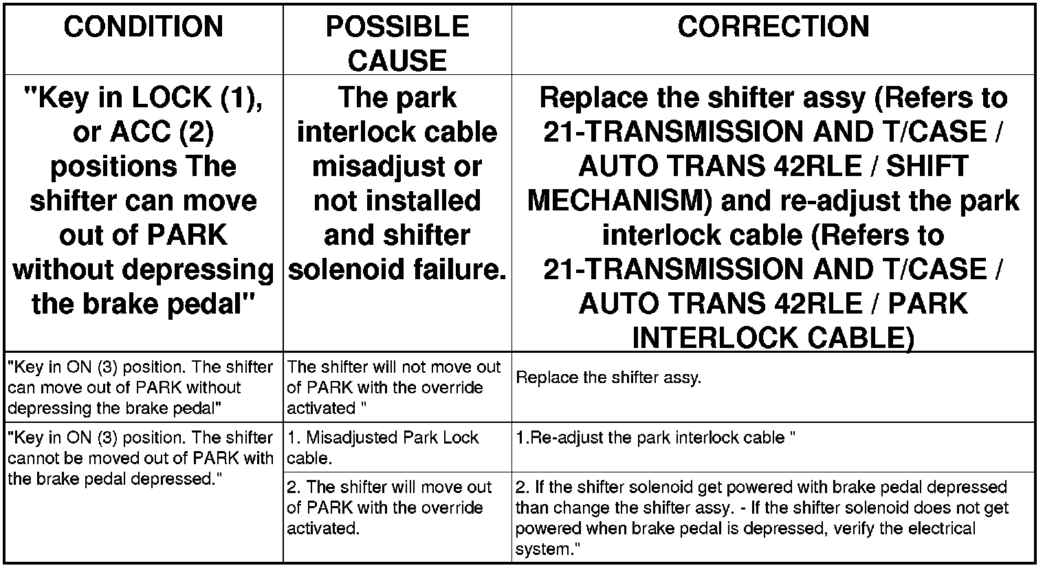 1. Shifting out of PARK should not be possible when the key is removed, or in LOCK (1) or in ACC (2), regardless of the brake pedal position.