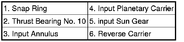 3. Install the number 9 thrust bearing onto the front of the reverse planetary carrier (7) with the outer race toward the carrier and the inner race facing upward.