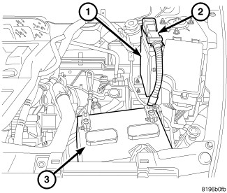 6. Disconnect both cables from battery (3).