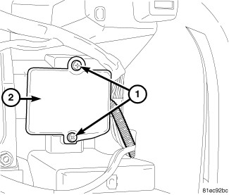 1. Install the remote start antenna module (2), and screws (1) to instrument panel assembly. Tighten screws to 2.5 Nm (22 in. lbs.).