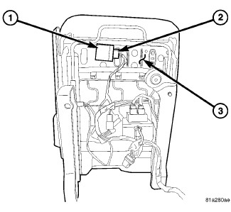 The heated seat module (1) is located under the left front seat. It has a single electrical connector (2) and a push pin style retainer that secures it to the seat pan (3). The module can be accessed from under the front left seat with the seat in the full back and up position.
