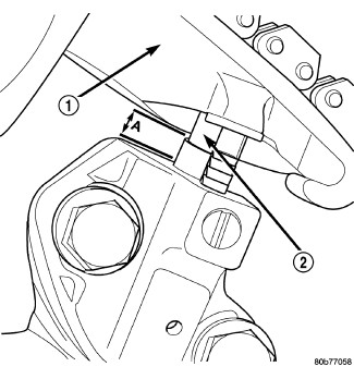 2. To determine if the secondary timing chains are worn, rotate the engine clockwise until maximum tensioner piston (2) extension is obtained. Measure the distance between the secondary timing chain tensioner housing and the step ledge on the piston. The measurement at point (A) must be less than 15mm (.5906 inches).