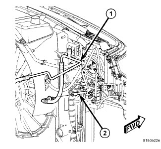 10. Connect the A/C liquid line (1) to the condenser tube (2) and install the secondary retaining clip Refrigerant Line Coupler - Installation.