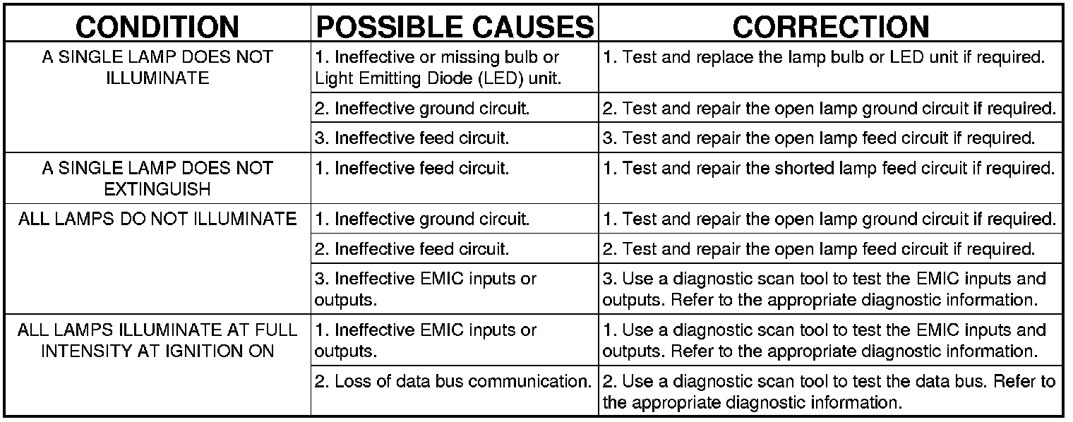 NOTE: When diagnosing the interior lighting circuits, remember that high generator output can burn out bulbs rapidly and repeatedly; and, that dim or flickering bulbs can be caused by low generator output or poor battery condition. If one of these symptoms is a problem on the vehicle, be certain to diagnose the battery and charging system, then repair as necessary.