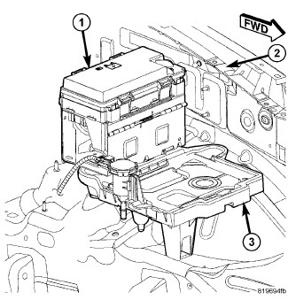 NOTE: The ASD relay is located in the Totally Integrated Power Module (TIPM) (1). The TIPM is located in the engine compartment near the left inner fender (2). Refer to label on TIPM cover for relay location.